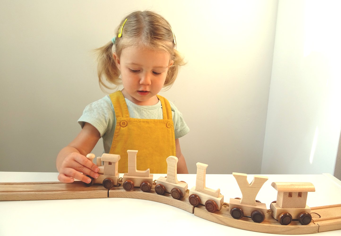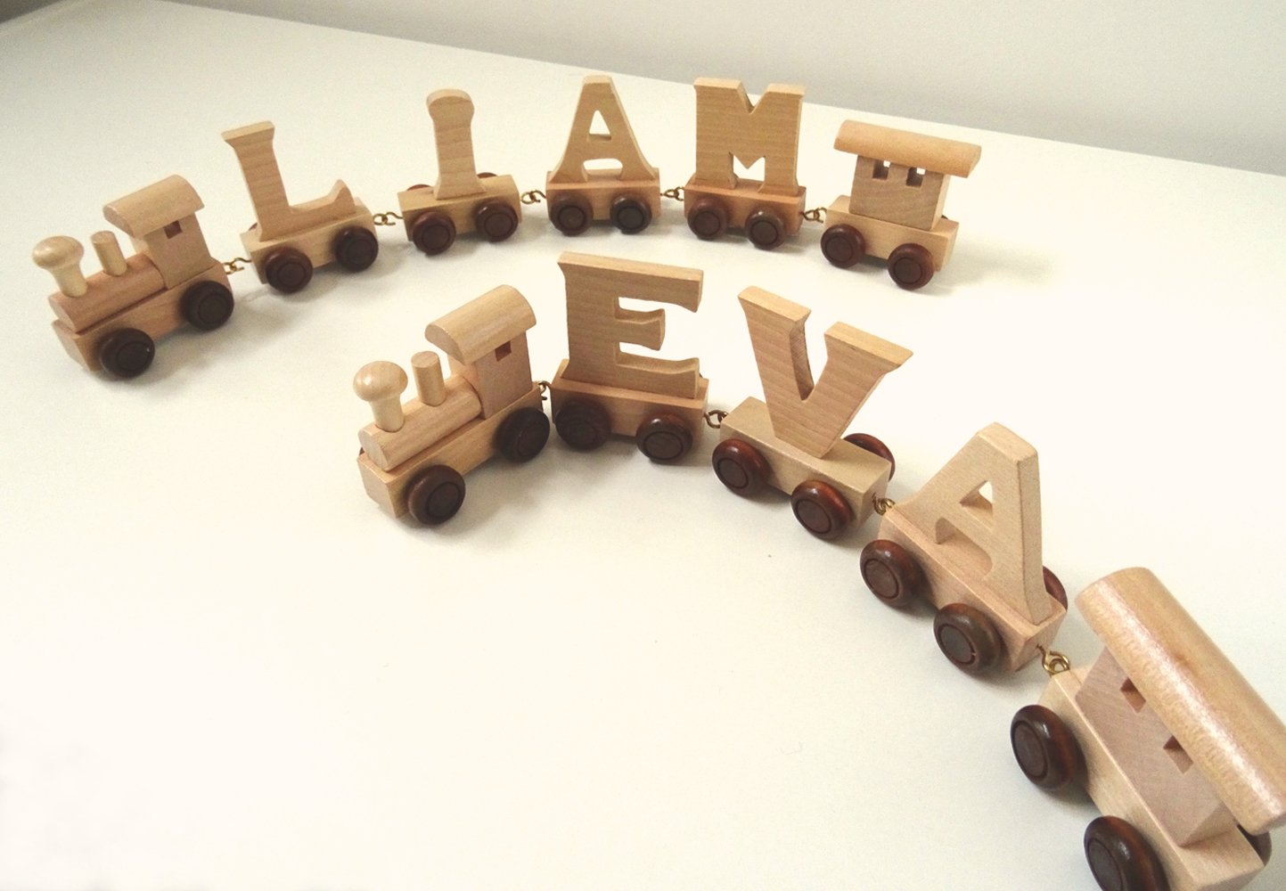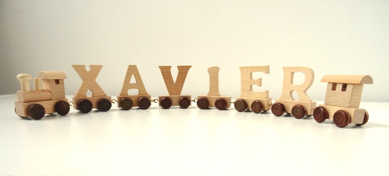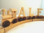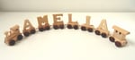 • A personalised train in a natural wood finish
